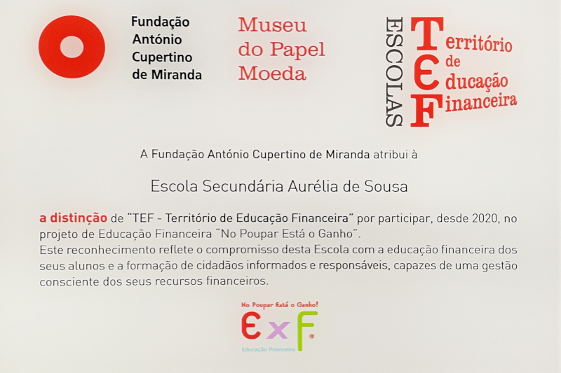A Fundação Cupertino de Miranda atribuiu à Escola Secundária Aurélia de Sousa a distinção de “Escola TEF – Território de Educação Financeira” por participar, desde 2020, no projeto de Educação Financeira “No Poupar Está o Ganho“.